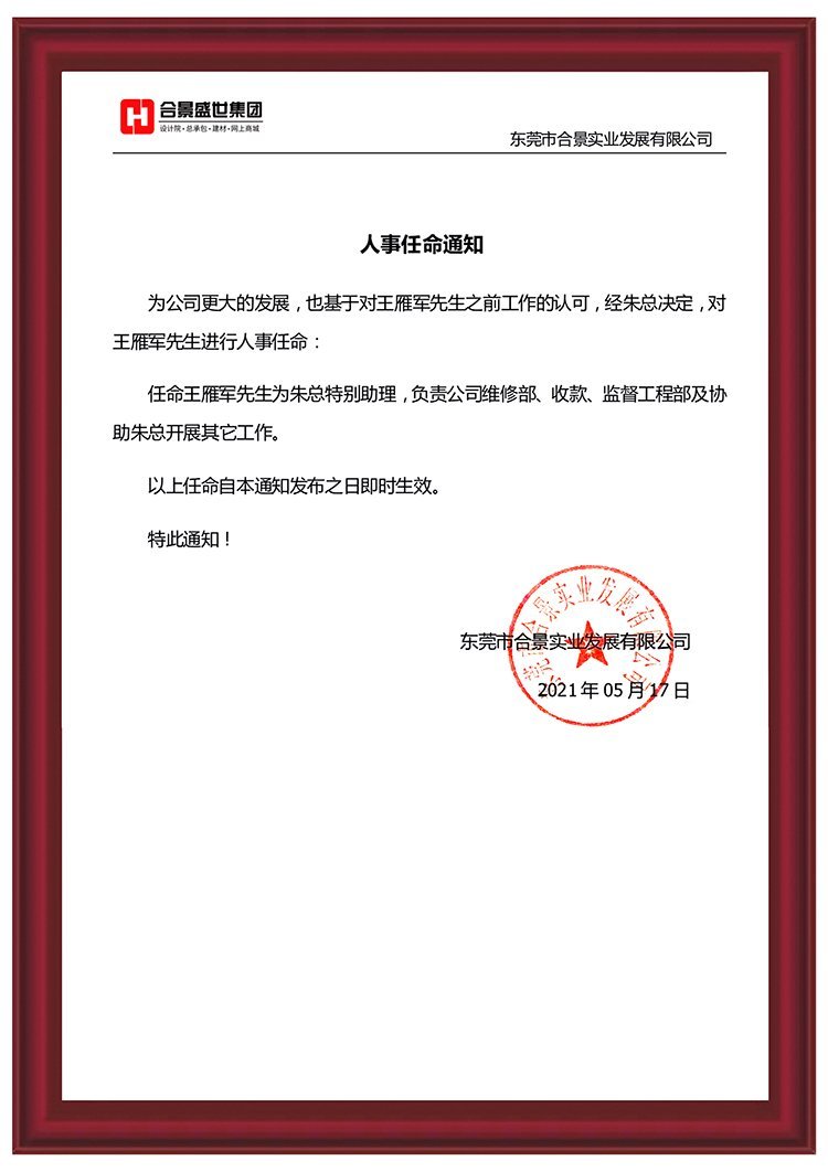 為推動公司更大發(fā)展,經(jīng)公司綜合評估,王雁軍先生將擔任朱總特別助理,負責公司維修部、收款、監(jiān)理部及協(xié)助總經(jīng)理開展其他工作。